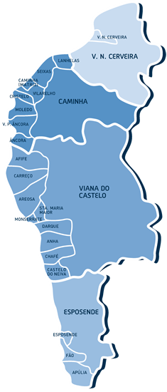 • Freguesias de Âncora, Caminha (Matriz), Cristelo, Lanhelas, Moledo, Seixas, Vila Praia de Âncora e Vilarelho (Município de Caminha).