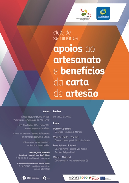 A Comunidade Intermunicipal do Alto Minho (CIM Alto Minho) vai organizar, em colaboração com a Associação de Artesãos da Região Norte, um Ciclo de Seminários – “Apoios ao Artesanato e benefícios da Carta de Artesão”, com o objetivo de informar os produtores sobre como obter/renovar e quais os benefícios da Carta de Artesão e UPA, e os apoios existentes ao artesanato através da divulgação do Programa de Promoção das Artes e Ofícios.