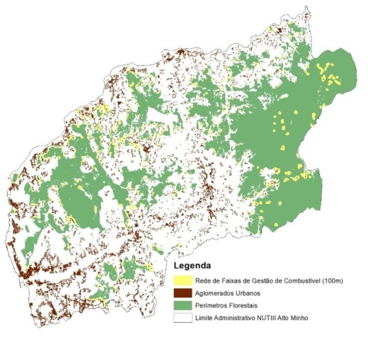 Numa análise preliminar, a CIM Alto Minho estimou, tendo por base cartografia oficial relativa à ocupação e uso do solo e ao regime florestal, que as faixas de proteção dos aglomerados populacionais que envolvem terrenos submetidos ao regime florestal (em cogestão com o Estado) representam cerca de 2.181 ha de faixas de gestão de 100 metros (conforme imagem abaixo). Neste contexto e só no que respeita às referidas faixas de proteção dos aglomerados populacionais que envolvem terrenos submetidos ao regime florestal (em cogestão com o Estado), torna-se necessário que, até final do mês de maio, o próprio Ministério da Agricultura, Florestas e Desenvolvimento Rural promova diretamente um investimento anual mínimo de gestão de combustível de 2,2 milhões euros nestas áreas da sua competência.