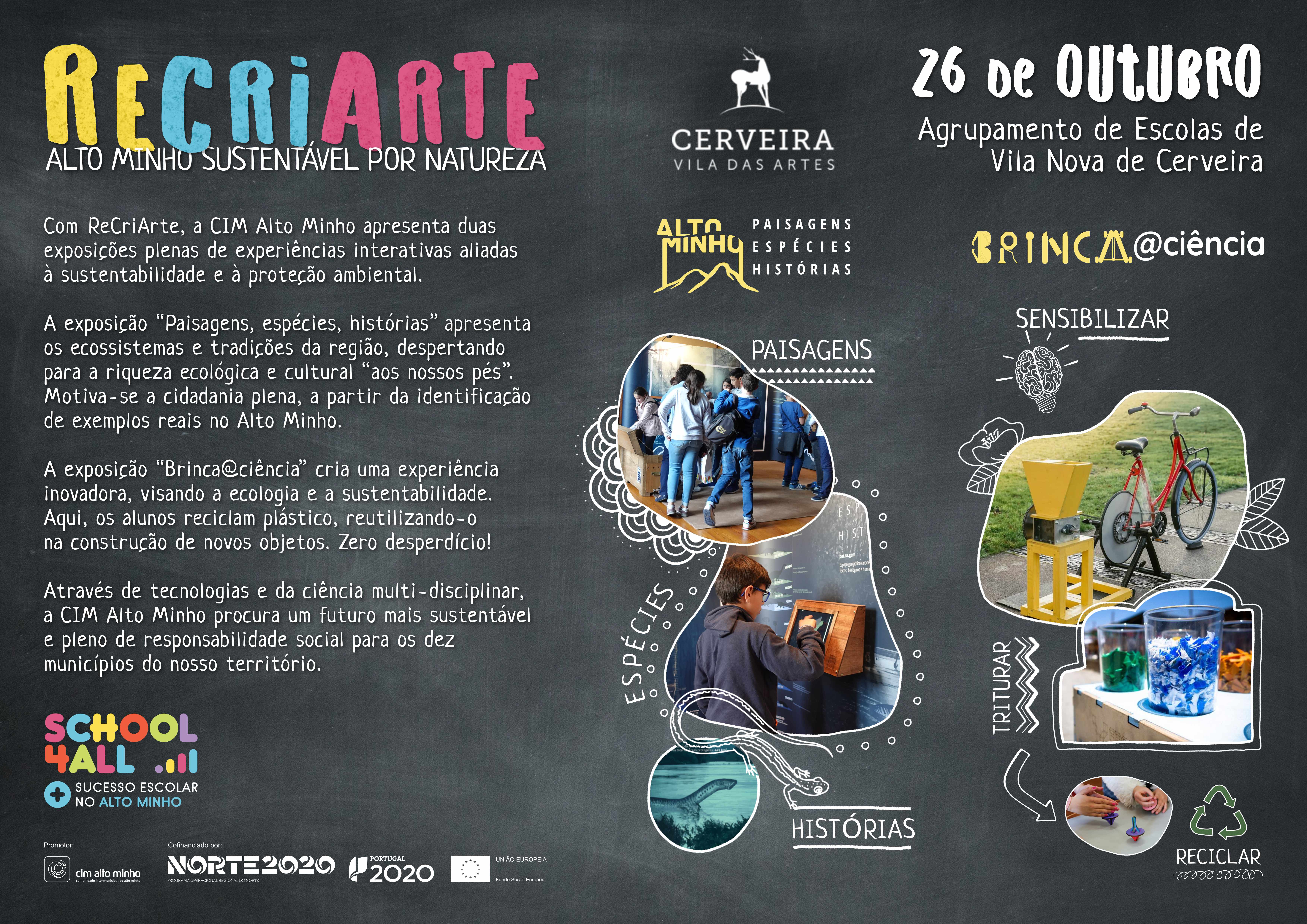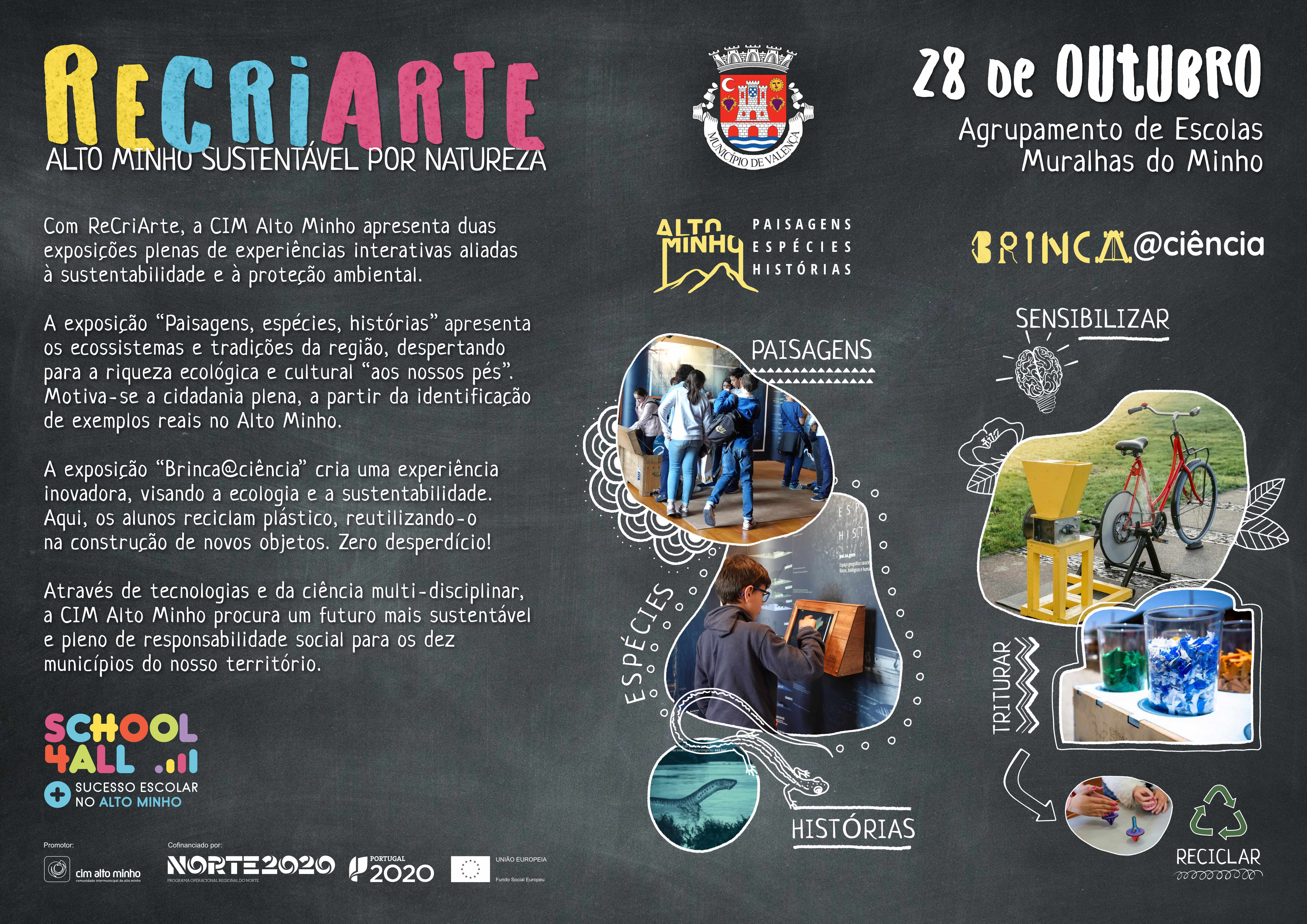 Também em outubro arranca a iniciativa "ReCriaArte: Alto Minho Sustentável por Natureza”, dirigida a alunos e professores do 2.º ciclo do ensino básico dos agrupamentos de escolas do Alto Minho. Esta iniciativa engloba a realização de duas exposições interativas aliadas à sustentabilidade ambiental e à proteção do meio ambiente. São elas: a exposição "Paisagens, espécies, histórias”, que mostrará os ecossistemas, as paisagens e as tradições do Alto Minho, procurando despertar o interesse para a riqueza ecológica e cultural do território e promover a cidadania, a partir da identificação de exemplos reais no Alto Minho e do cruzamento dos aspetos ambientais com os sociais e culturais; e a exposição "Brinca@ciência”, que proporcionará uma experiência inovadora, visando a ecologia e a sustentabilidade. Nesta exposição, os alunos terão a oportunidade de reciclar plástico, reutilizando-o na construção de novos objetos. Através de tecnologias e da ciência multidisciplinar, procura-se com esta iniciativa promover a responsabilidade social e um futuro mais sustentável para o Alto Minho.