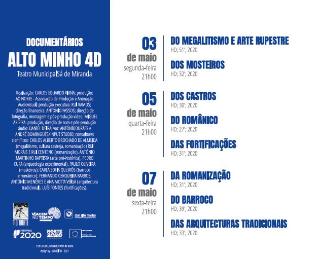 Com um investimento global de cerca de dois milhões de euros, cofinanciado pelo Programa Operacional Regional do Norte 2014-2020 (NORTE 2020), dos quais cerca de metade foi alocado aos municípios para a execução das estações do tempo, o projeto "Alto Minho 4D – Viagem no Tempo” incluiu o desenvolvimento de muitas outras atividades, em parceria com diversas associações culturais e recreativas do Alto Minho, uma das quais a AO NORTE - Associação de Produção e Animação Audiovisual, que produziu 10 documentários e cuja estreia está marcada para os próximos dias 3, 5 e 7 de maio, pelas 21h00, no Teatro Municipal Sá de Miranda, em Viana do Castelo.