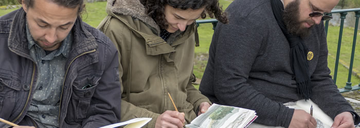 Paralelamente à conferência, um grupo de sketchers contava em desenhos as histórias e pormenores do património de Monção, no âmbito da ação "Sketching com História”, inserida no mesmo projeto. Eduardo Belga, aluno de Doutoramento em Artes Plásticas, na Universidade do Porto, foi um dos que aceitou o desafio e viajou do Porto até Monção na busca de matéria que despoletasse a sua criatividade. A ação "Sketching com História” serviu de pretexto para este brasileiro visitar, pela primeira vez, a vila de Monção. "A vista sobre o rio chamou logo a nossa atenção”, contou-nos no início da sua chegada, acompanhada de dois outros colegas: Evandro e Najla. O primeiro encantou-se pela "junção da arquitetura com a natureza”, enquanto a companheira realça a arquitetura histórica das casas e restante património.