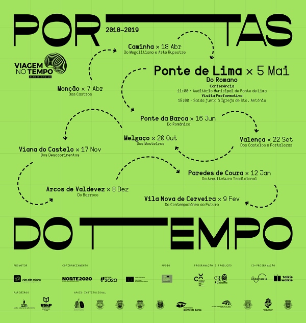 Depois de Ponte de Lima, as Portas do Tempo serão abertas nos restantes sete concelhos do Alto Minho, dinamizando uma atividade por mês em cada município. Assim, no dia 16 de junho, Ponte da Barca acolhe a "Rota do Românico”; no dia 22 de setembro, Valença recebe a "Rota dos Castelos e Fortalezas”; Melgaço, no dia 20 de outubro, a "Rota dos Mosteiros”; Viana do Castelo, a 17 de novembro, a "Rota dos Descobrimentos”; Arcos de Valdevez, no dia 8 de dezembro, a "Rota do Barroco”; Paredes de Coura, a 12 de janeiro de 2019, a "Rota da Arquitetura Tradicional”; e, finalmente, a viagem termina em Vila Nova de Cerveira, no dia 9 de fevereiro do próximo ano, com a "Rota do Contemporâneo ao Futuro”.