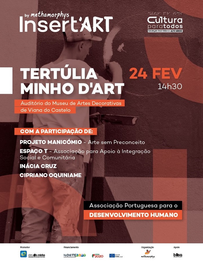 Sob o tema "Minho d’Art”, realiza-se no próximo dia 24 de fevereiro, pelas 14h30, no auditório do Museu das Artes Decorativas de Viana do Castelo, uma tertúlia que irá reunir associações e artistas para partilha das suas experiências de inclusão através da arte. A iniciativa insere-se na ação "Insert’arte”, que está a ser desenvolvida pela Associação Portuguesa para o Desenvolvimento Humano – Methamorphys no âmbito do projeto "Cultura para Todos” da Comunidade Intermunicipal do Alto Minho (CIM Alto Minho).